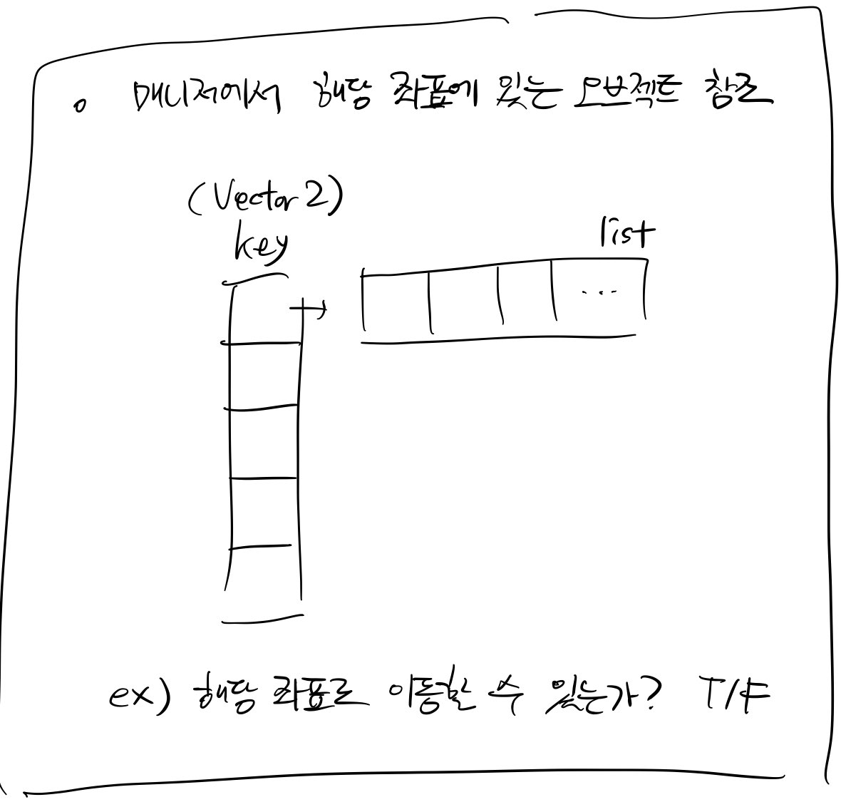 해당 좌표로 캐릭터가 이동할 수 있는지 알아보려면, 리스트를 모두 조사해서 결과값을 얻어내면 되겠지.