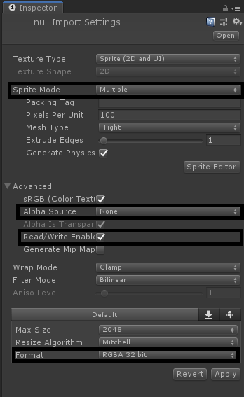 임시로, 스프라이트 에디터에서 Slice를 수행하기 위해 설정한다.