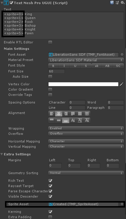 이제 TMPro Text에 스프라이트를 불러오는 구문을 입력하고, Extra Settings의 Sprite Asset을 설정하기만 하면 된다.