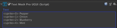 예시로, <sprite=5>를 입력한다면 만들어진 Sprite Asset의 6번째 이미지가 텍스트 내에 표시될 것이다.