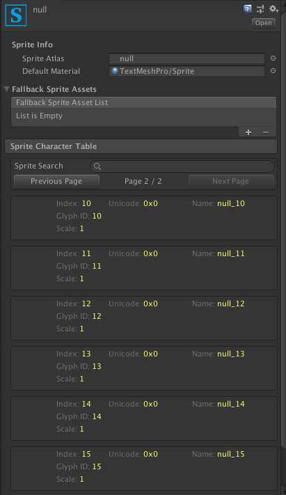 이후 해당 스프라이트에 우클릭 > Create > TextMeshPro > Sprite Asset 메뉴를 선택하면, 16개의 아이콘이 생성된 것을 확인할 수 있다. 비록 지금은 모든 게 투명일지라도 말이다.