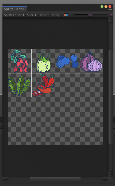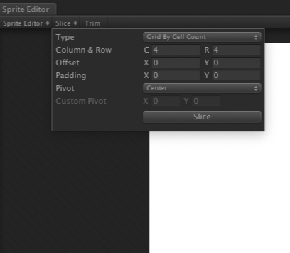 네가지 옵션을 수정한 뒤, Sprite Editor를 열어 Slice 작업을 수행했다. 이렇게 16개의 영역을 나눌 수 있었다.