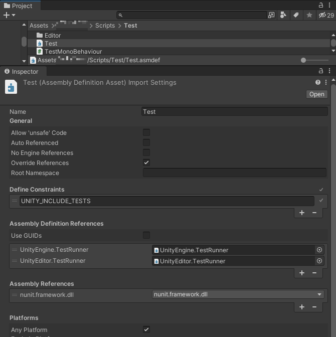 UnityEngine.TestRunner와 UnityEditor.TestRunner, nunit.framework.dll가 레퍼런스에 추가되어 있다.
