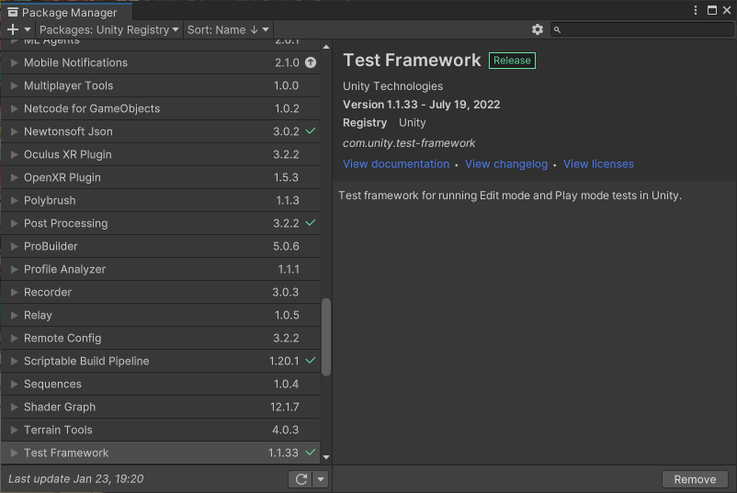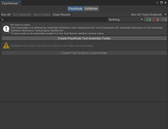 Package Manager에서 Test Framework를 설치하고, Window/General/Test Runner를 실행해준다.