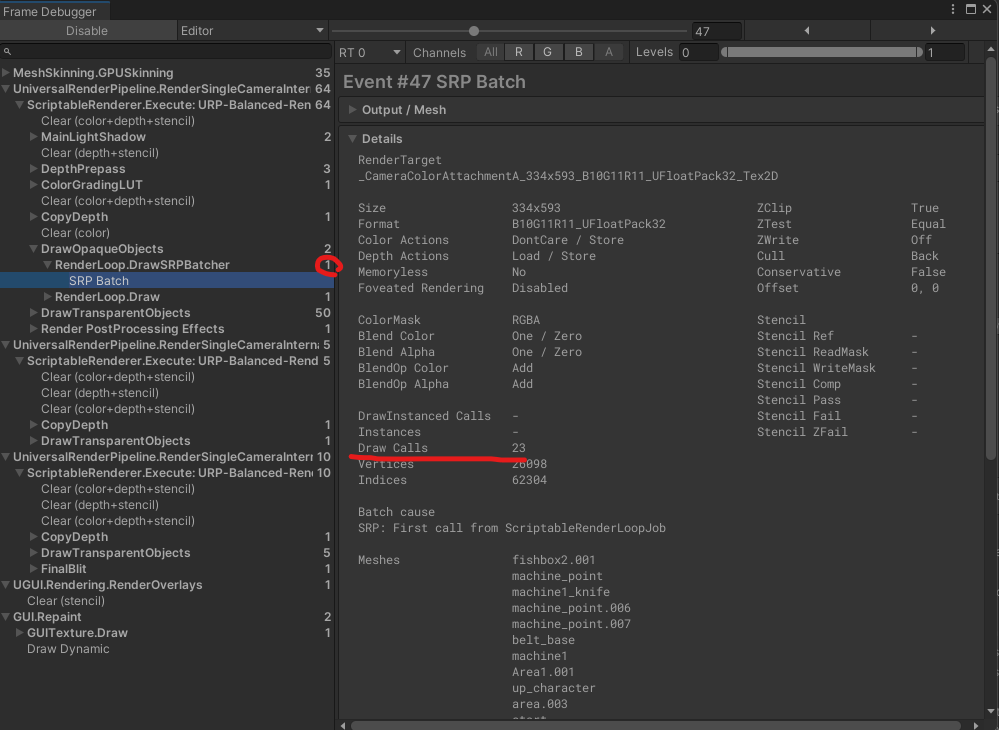 스크린샷에서는 23개의 드로우 콜이 호출되었지만 SRP Batch로 인해 하나로 묶여 있는 것을 확인할 수 있다.