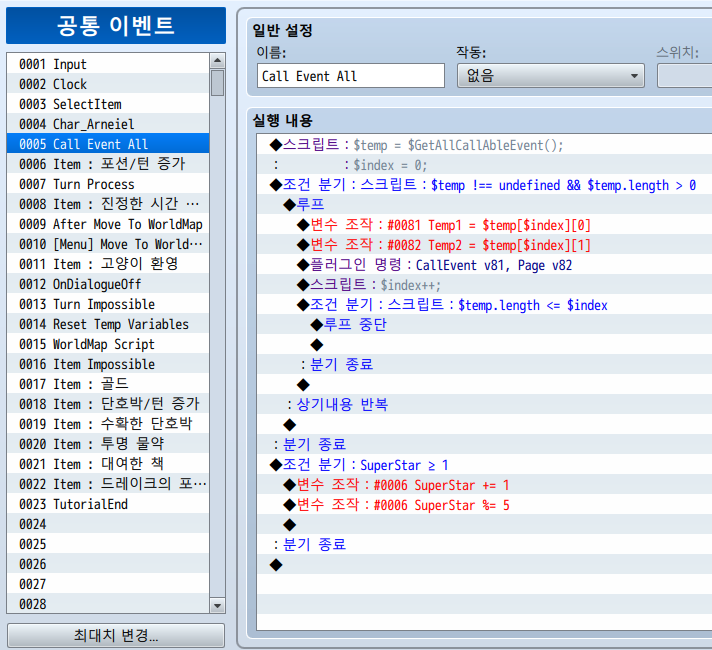 이 구현을 위해 웬만한 것들은 커먼 이벤트와 스크립트로 처리했다.