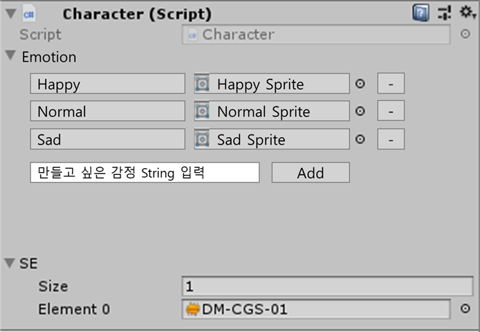 리스트에는 Emotion의 이름과 Sprite를 매핑할 수 있는 칸이 뜨고, - 버튼을 눌러 삭제할 수 있게 구상하였다.