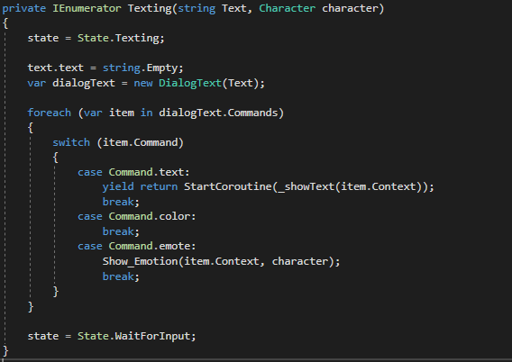 Show를 한 시점에서, 해당 string이 <List>Commands 형태로 분해되고, Texting 코루틴에서 실행된다.