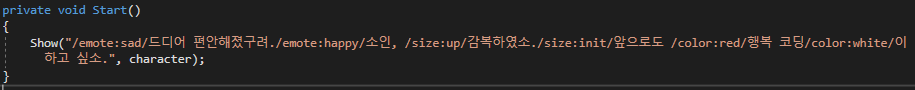 Show("이것은 /size:17/대화창이다. /emote:Sad/하지만 /color:red/'언젠가는' /color:white/ 완성되겠지. /emote:Happy/^O^", character);
